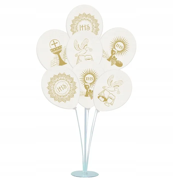 - 7 szt. balonów z nadrukiem komunijnym (w zależności od dostawy ilość powtórzonych wzorów może się różnić od tego przedstawionego na zdjęciu)
